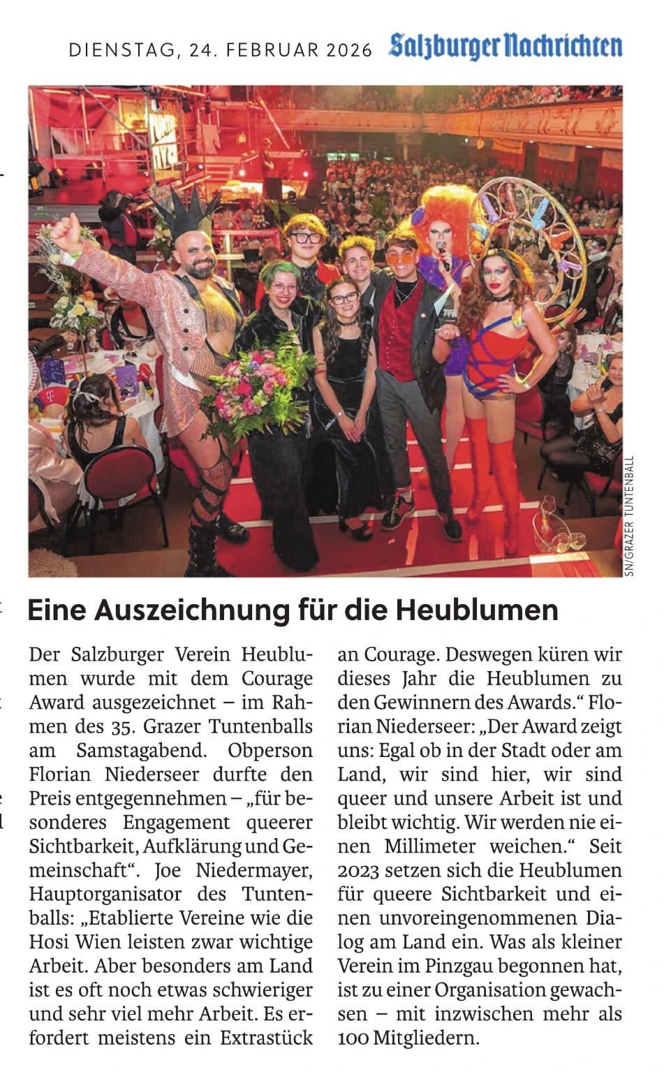Anlässlich des 35. Grazer Tuntenballs am 21. Februar gewann der Salzburger Verein Heublumen den Courage Award. “Für besonderes Engagement queerer Sichtbarkeit, Aufklärung und Gemeinschaft” durfte die Obperson Florian Niederseer den Preis entgegennehmen. Eine Premiere und besonderer Moment für den noch jungen Verein.